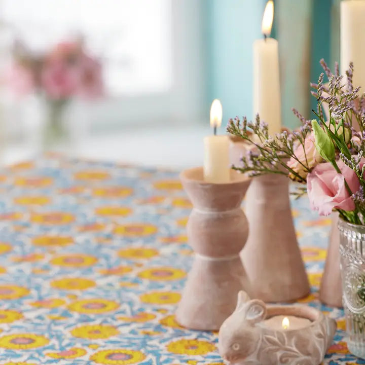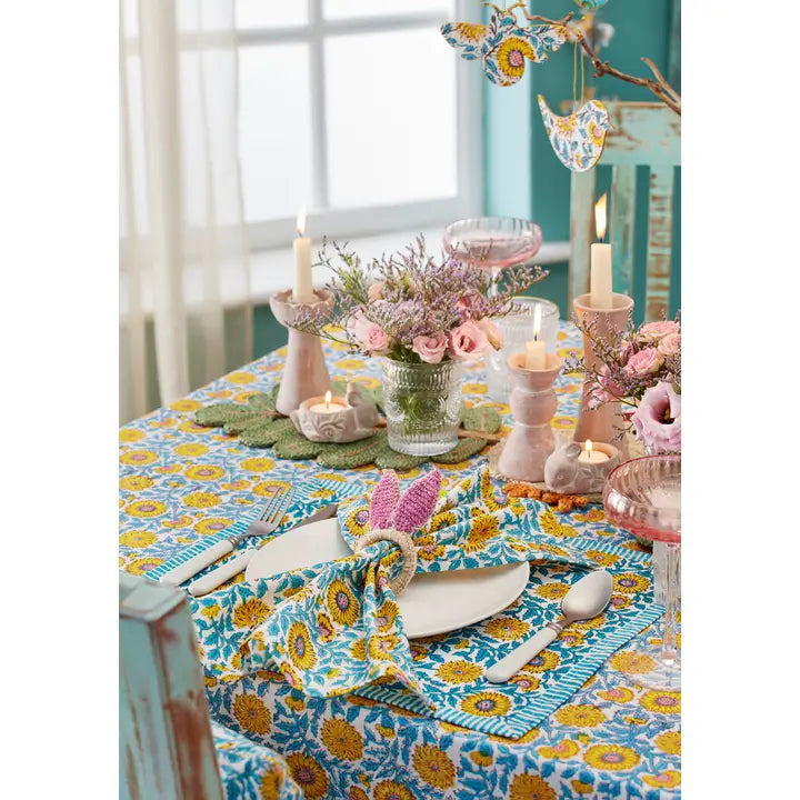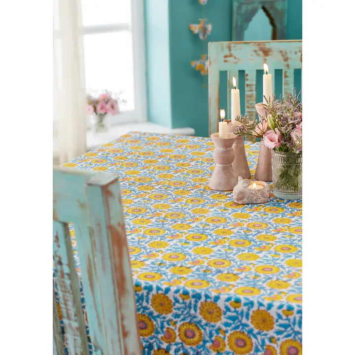 Dit handgemaakte tafellaken is bedrukt met een vrolijk zonnebloemenpatroon. Dankzij de ambachtelijke blockprint-techniek en het stevige katoenen materiaal is het een opvallend én duurzaam stuk. Combineer het met bijpassende tafeldecoraties of servetten voor een harmonieus geheel, of gebruik het als blikvanger op zichzelf.