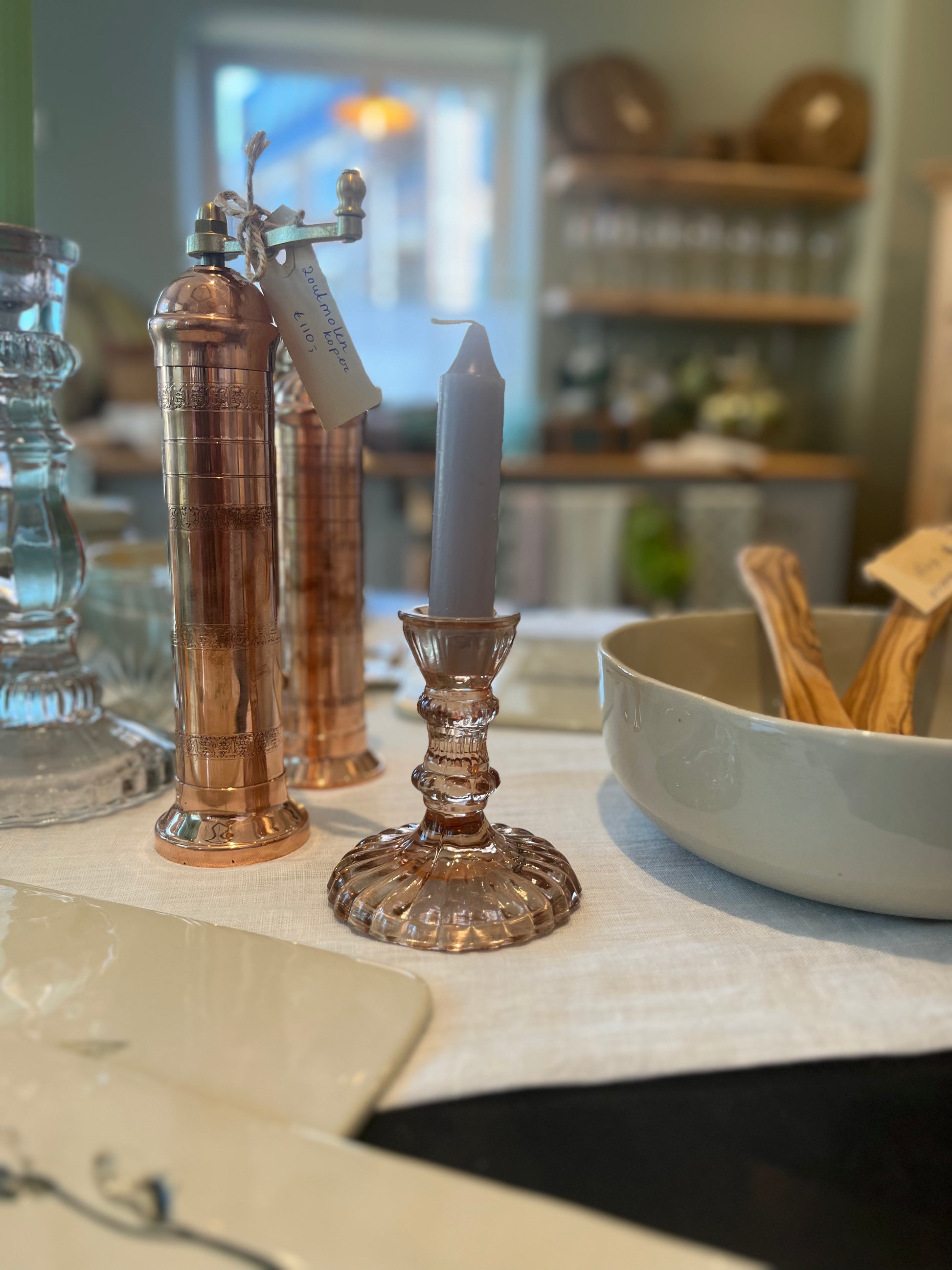 Glazen perzikkleurige kaarsenhouder, leuk om te combineren met de andere maten.