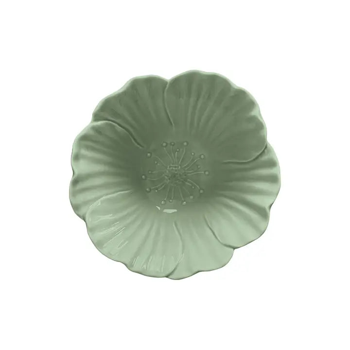 Een verfijnd aardewerken schaaltje in zachte matchagroene tint, gevormd als een openbloeiende bloem. Subtiel glanzend geglazuurd en rijk aan detail, ideaal om een vleugje poëzie toe te voegen aan je gedekte tafel.