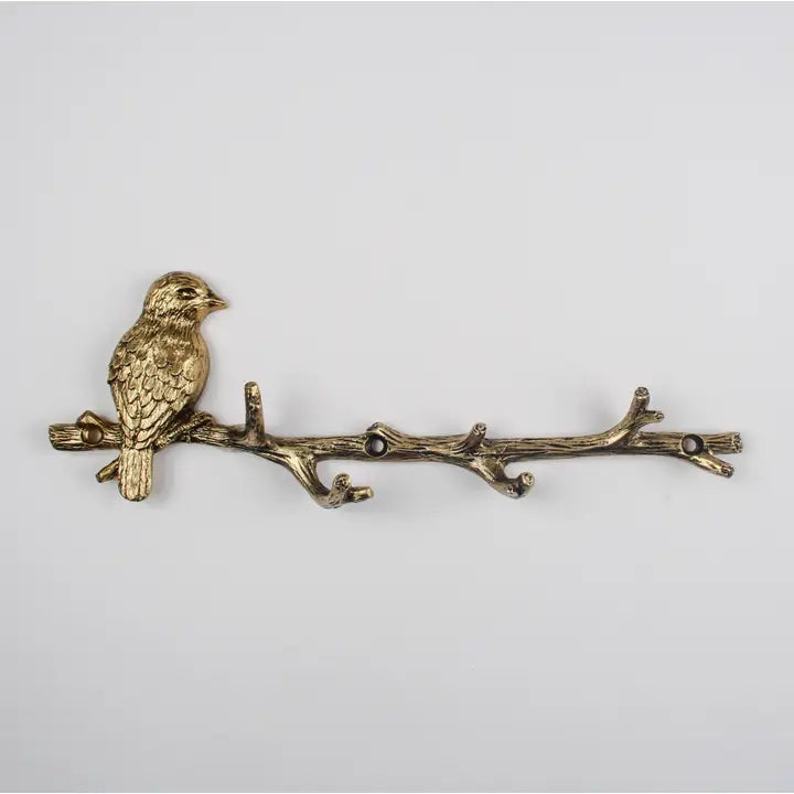Breng een vleugje natuur in huis met deze elegante wandhaak in de vorm van een vogel zittend op een tak. Met vijf stevige haken biedt dit functionele kunstwerk volop ruimte voor jassen, sleutels, keukendoeken of sieraden. De antiekgouden afwerking geeft het geheel een warme, vintage uitstraling.