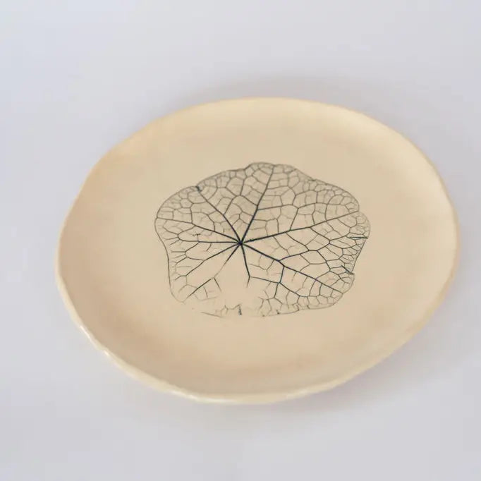 Een handgemaakt dessertbord van keramiek, versierd met een fijn botanisch bladmotief in zachtgroen-blauw. Elk bord brengt een vleugje lente op tafel – perfect voor een taartpunt, ontbijt of een klein gerecht.
