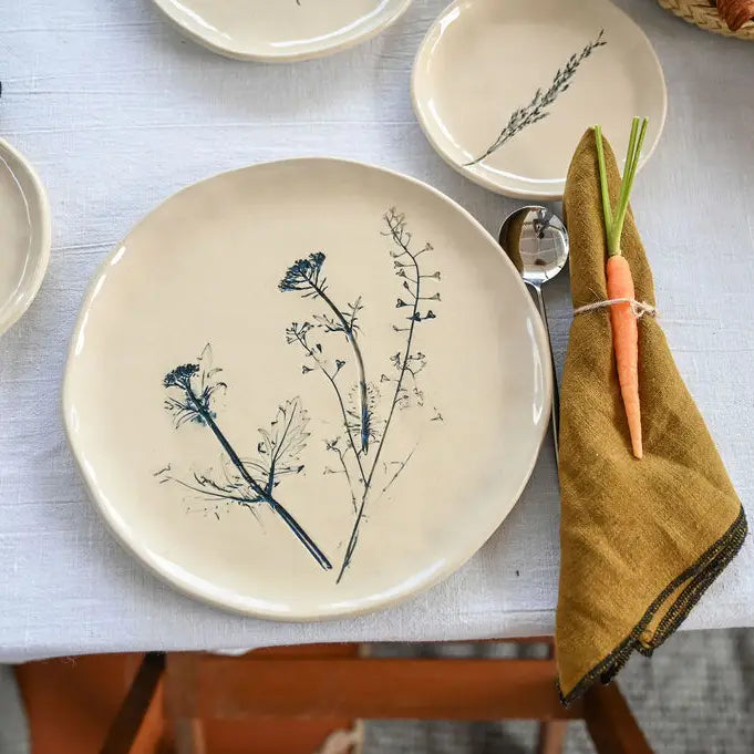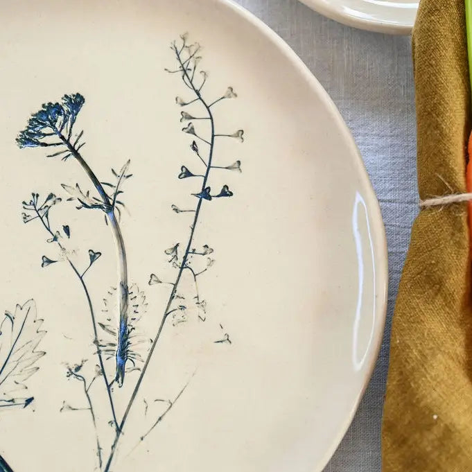 Breng de frisheid van het voorjaar naar tafel met dit keramieken dinerbord, gedecoreerd met een subtiele blauwgroene bloemenprint. Dit bord is met de hand vervaardigd in Portugal en straalt eenvoud, vakmanschap en natuurlijke elegantie uit.