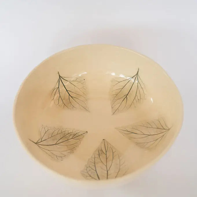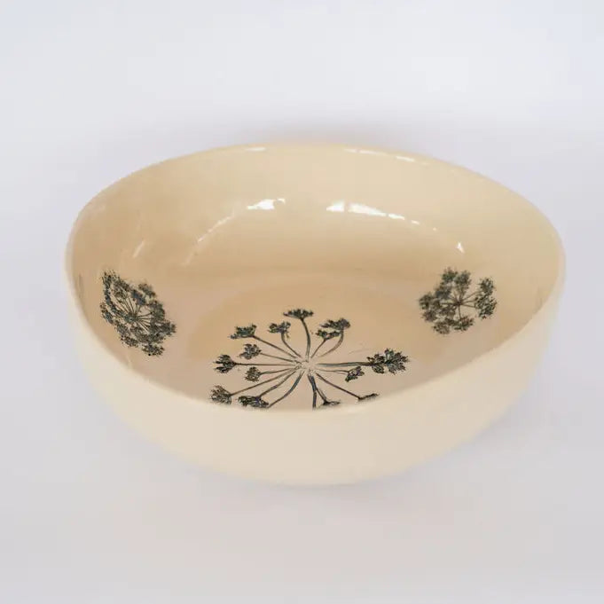Breng een vleugje lente op tafel met deze handgemaakte keramieken slaschaal, gedecoreerd met fijne botanische prints in blauwgroene tinten. Perfect voor het serveren van salades, fruit of bijgerechten tijdens een gezellige maaltijd.