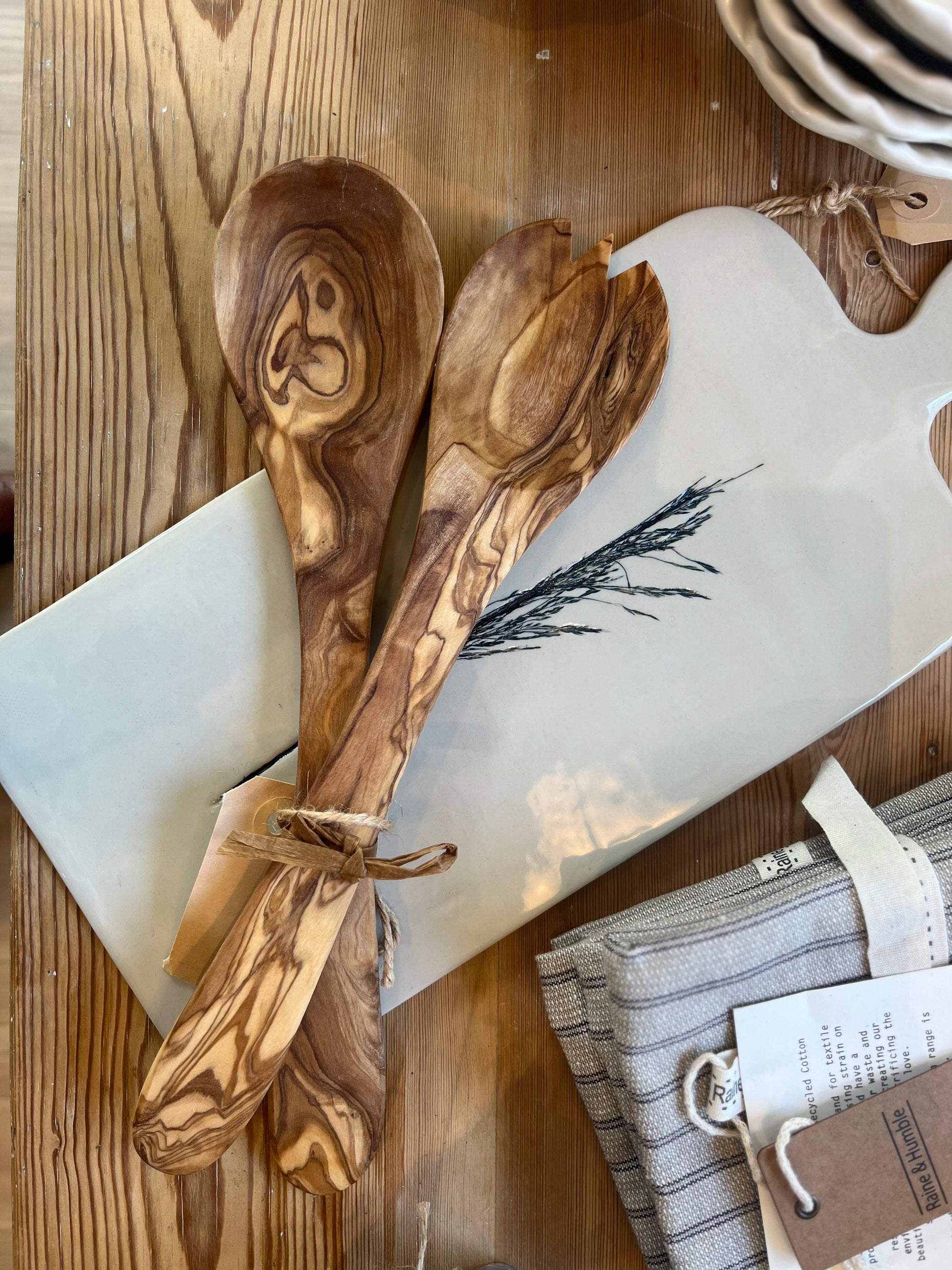 Saladebestek verbonden met een milieuvriendelijke raffiaband in plaats van een elastische band. Prachtige 2-delige saladeset gemaakt van olijfhout met expressieve korrel. 1 x saladelepel en 1 x saladevork.